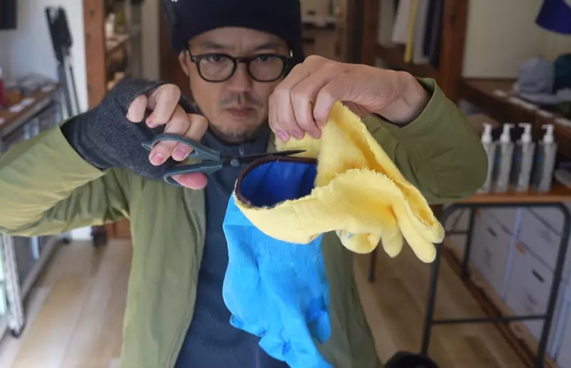 ハサミで裏起毛をカットし、丁寧に剥がす