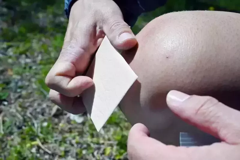 ハイドロコロイド包帯自体が吸収パッドになっているので、これ1枚で止血もできますが、大きな傷を負った時はヘモスタパッドで圧迫止血し、その上からハイドロコロイド包帯を貼るのがおすすめです。フィルムドレッシング材で密閉する必要がなくなり、移動時もとれづらいです。