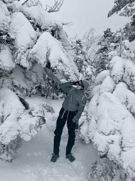 ということで、意図的に景色の話を出すようにしたが、今日はあいにく曇っていて景色は何も見えない。見えるのは手前の木々にできた氷柱たちだ。雪山は手前の景色だけでも十分楽しいから本当にいい。