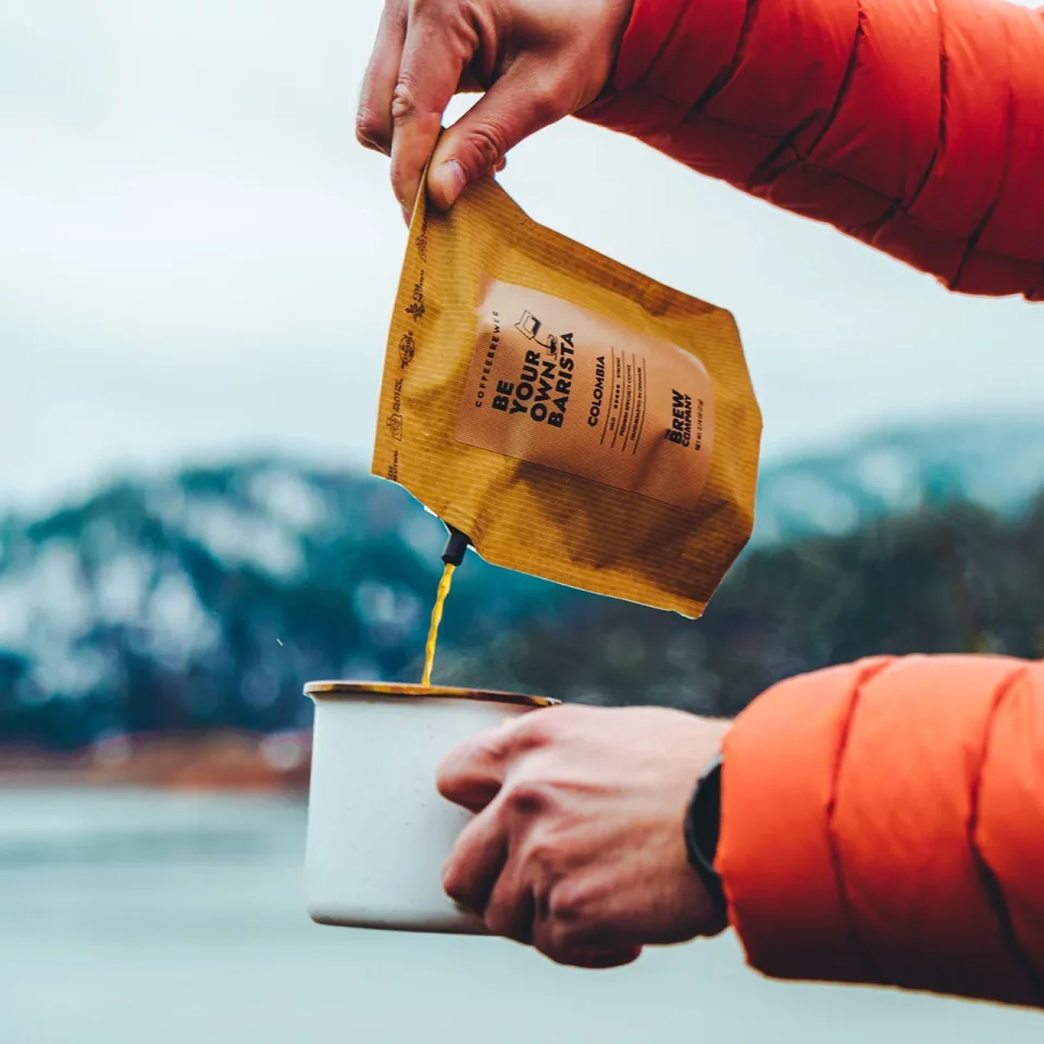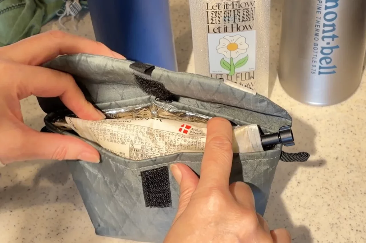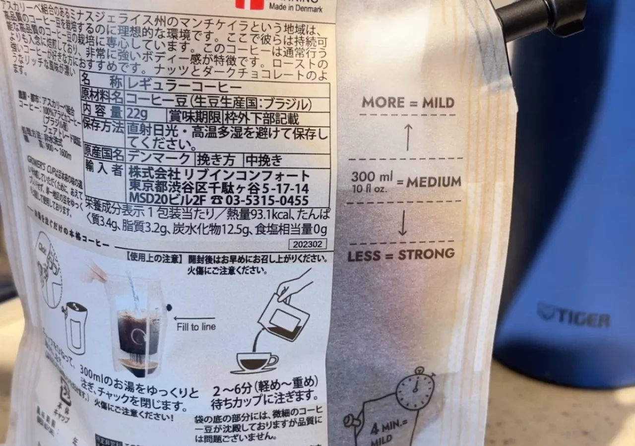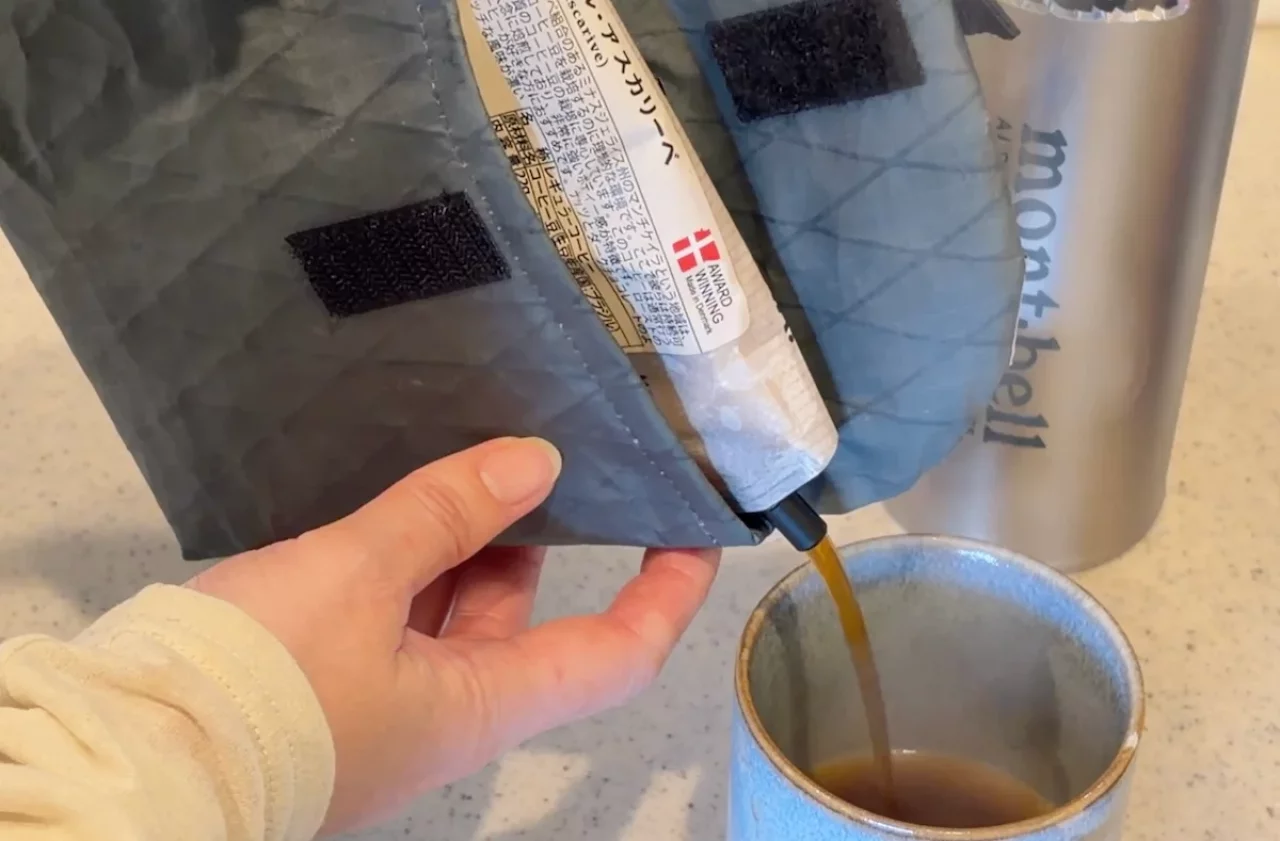 食後は**Grower's Cup(グロワーズカップ)**で本格的なコーヒーを楽しみます。パック自体が抽出器具になり、お湯を注ぐだけでバリスタの味が楽しめます。抽出中はおにぎりのコジーに入れて保温するのがコツです。