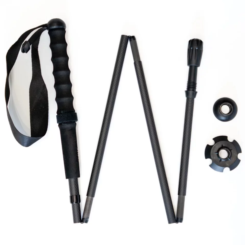 体力に自信がない方は、膝や腰の負担軽減、転倒防止、推進力向上のために必須です。愛用しているのは山旅の「3Kカーボン-ULトレッキングポール」。120cmで124gと非常に軽く、4つ折りで30cmまでコンパクトになるため、お守り代わりに持ち歩いています。