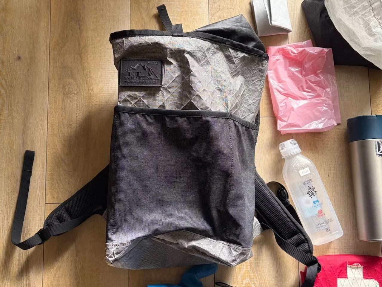 僕が活用しているのは**ULA Equipment(アメリカ)**の25Lザックです。シンプルで無駄のないデザインが魅力で、ノートパソコンも収納しやすいため街歩きにも馴染みます。 重量はわずか389g。素材には耐久性に優れた「Ultra200x」が使用されています。外側のストレッチ素材「Venom」には、水筒やすぐに取り出したいウィンドブレーカー、行動食などを入れています。