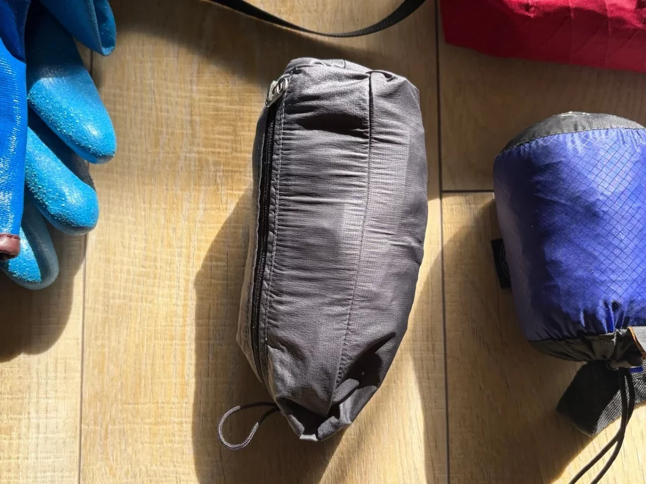 レインジャケットと兼用せず、別途100g以下の軽量なものを持参します。冷え込みが激しい時、レインジャケットだけでは不十分な場合があるためです。