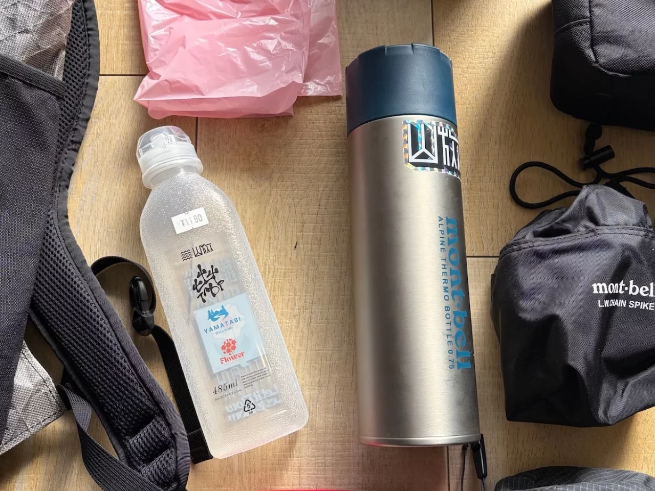 冬は500mlの透明ボトルと、500〜700mlの保温ボトルの2段構えです。保温ボトルには生姜と黒糖を入れたホットドリンクを入れています。水量は、発汗の多い夏は2L、冬は1Lを目安に調整します。