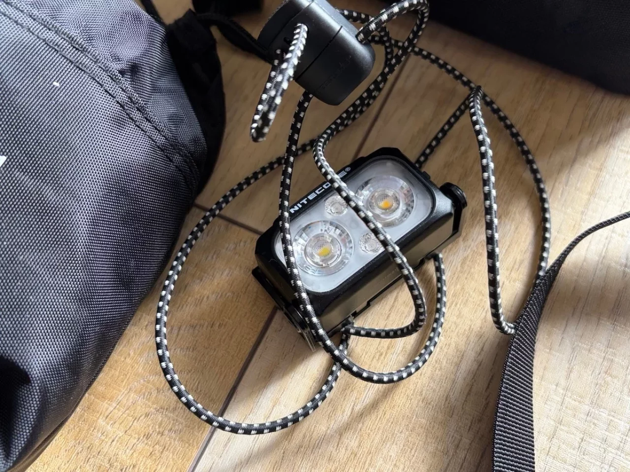 冬は17時でも薄暗くなるため、日帰りでも必須です。Nitecoreの「NU25」(48g)を使用しています。