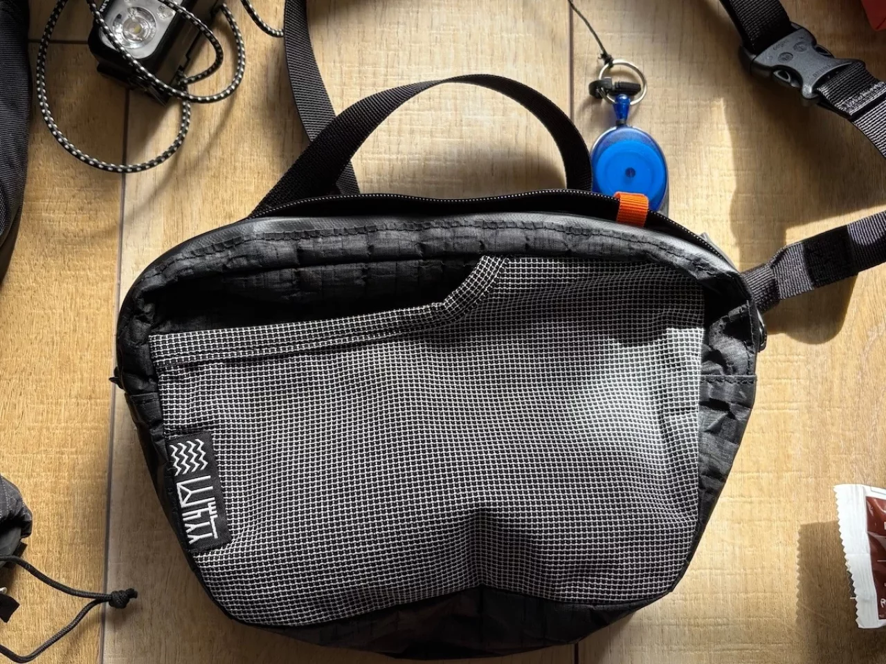 貴重品の紛失を防ぎ、タオルや日焼け止め、行動食をすぐに取り出せます。岩場などサコッシュが邪魔になる場所ではウエストポーチに切り替えています。