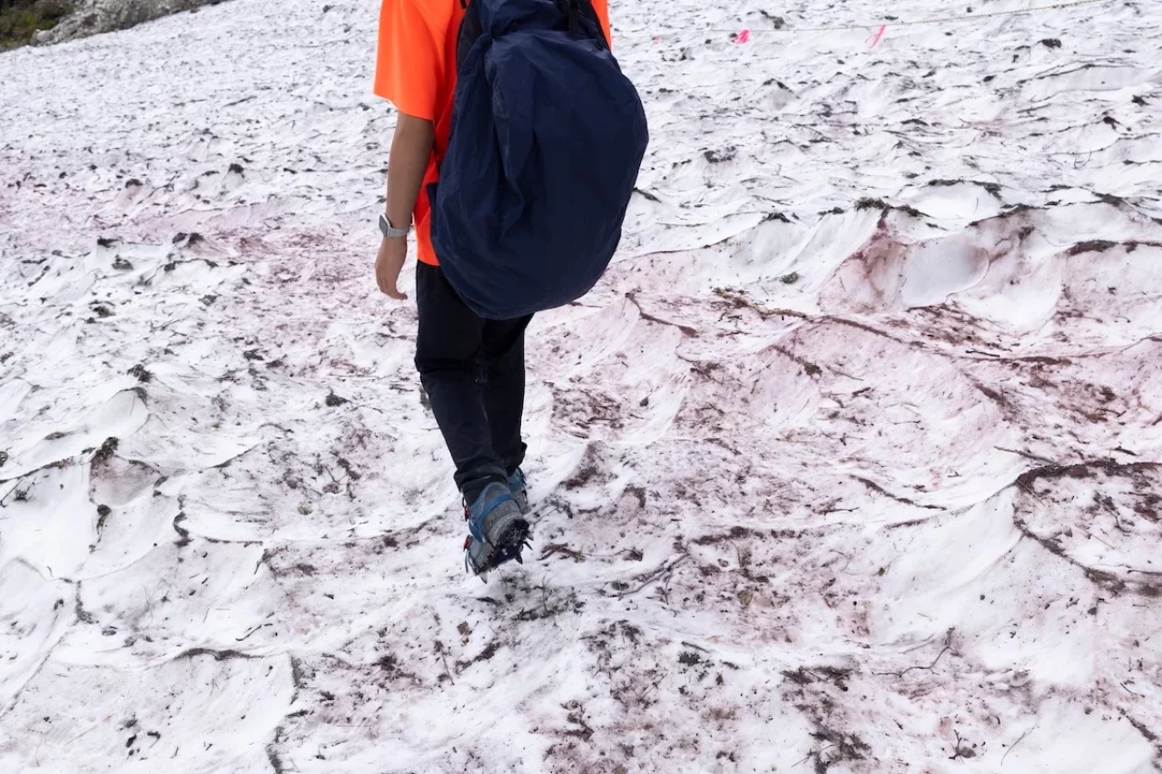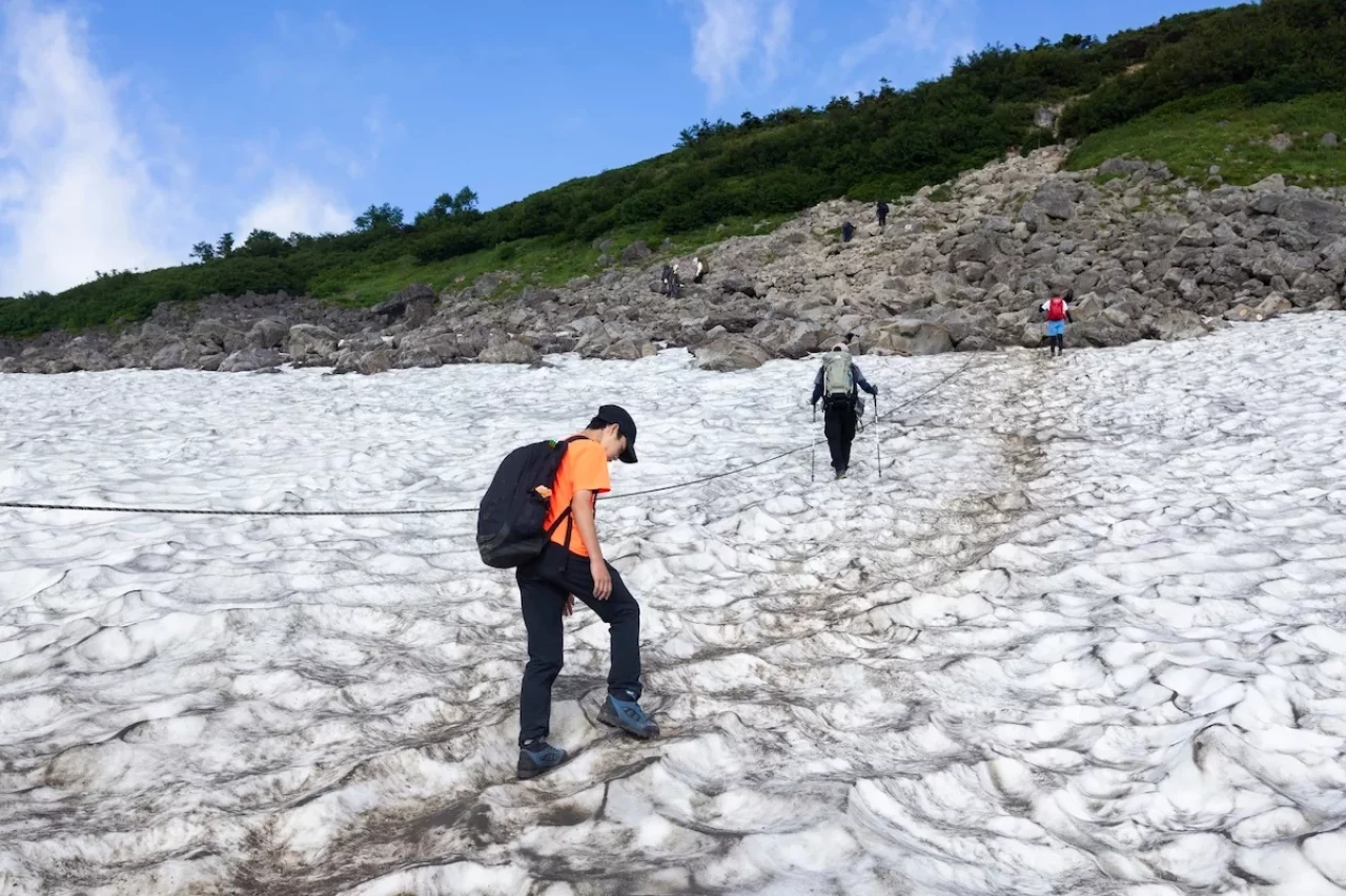 特に夏場から秋口にかけての雪渓(谷間に雪が残っている場所)のある登山道などで、雪の表面が溶けて柔らかくなっている状況では、短い爪のチェーンアイゼンでは滑りやすくなります。このような場面では、雪の奥深くまで爪を刺すことができる軽アイゼンが適しています。深く雪に爪を刺すことで足場の崩れを防ぎ、安定した歩行が可能になります。