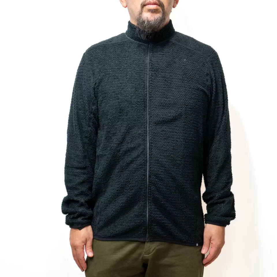 このミドルレイヤーの最大の特徴は、裏地を排除したポーラテック・アルファダイレクト90を使用している点にあります。従来のフリースとは異なり、繊維がダイレクトに肌やベースレイヤーに触れることで、効率よくデッドエアを蓄えつつ、余分な熱気と湿気を瞬時に逃がします。