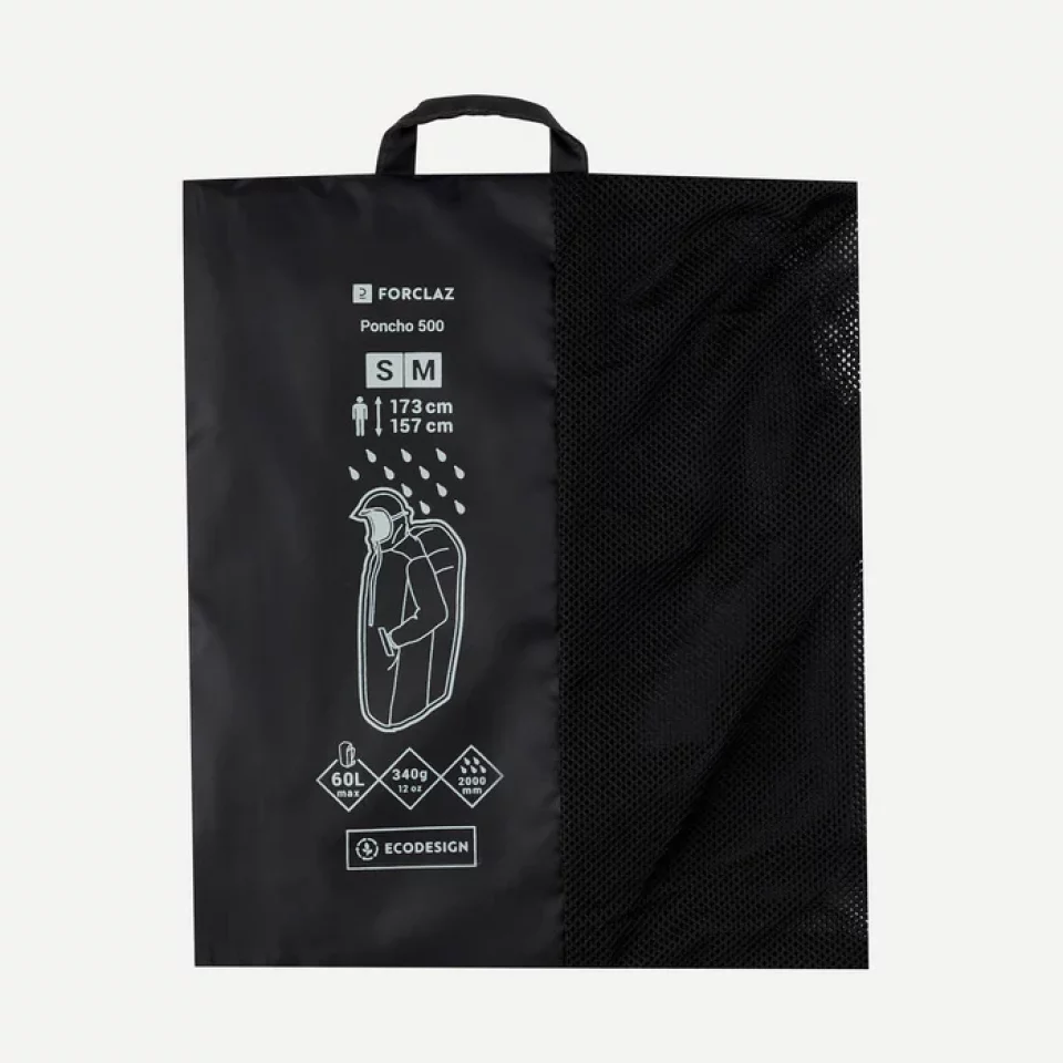 デカトロンのフォルクラ トレッキングレインポンチョは、最大60Lクラスのザックまでカバーできるサイズ展開が特徴の、登山・トレッキング向けポンチョです。 S/Mサイズでも約340gとやや重めですが、そのぶん丈と幅にゆとりがあり、テント泊用の大きめザックを背負う山行や、荷物の多い雨予報の日にも安心して使えます。