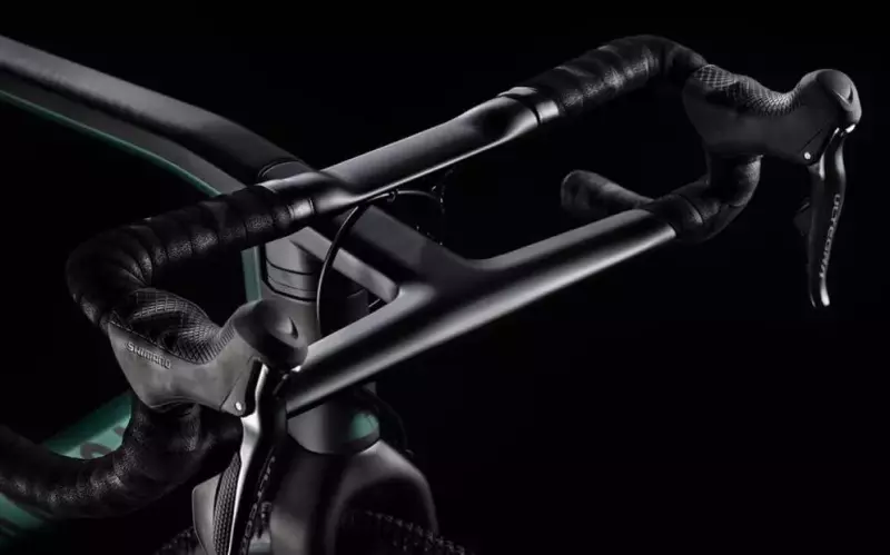 「グレイルコクピット」の最も⾰新的な部分は、上ハンドル部にあります。カーボンファイバーの持つ弾性を活かし、路⾯からの衝撃の⼊⼒とライダーのハンドルへの荷重によりハンドルが適度に変形。これにより衝撃と振動が打ち消され、ライダーには⾶ぶように⾛る感覚として伝わります。そしてステムから下ハンドル部に伸びる接合部に親指を引っ掛けて下ハンドル部を握ることにより、未舗装路の下りも安定した⾛⾏が可能になります。