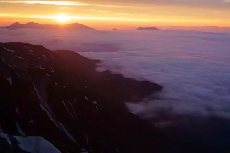 朝焼け~雲海広がる朝。天気は下り坂のようです。早朝上空の雲が広い範囲で紅く焼けました。その後高曇りで推移していますが、昼頃からは雨が降り出してくる予報です。長野県(大雪渓)側はきれいな雲海が広がっています。
