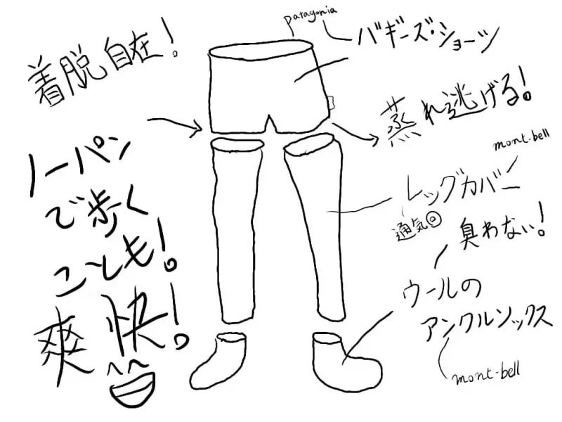上半身で半袖シャツ+アームカバーが有効であったように、下半身においても半ズボン+レッグカバーというのは有効でした。前半1,700kmほど進んで、持参のトレイルランニングショーツは穴があき、ウエストの紐が脱腸したようになってしまいました。補修が間に合わなくなってトレイルに集中できなくなってしまったので途中からpatagonia社のバギーズ・ショーツに替えました。バギーズ・ショーツは女性用(!)の丈の短いの(!!)を履いていました。
