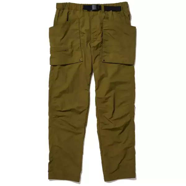 ナチュラルな風合いが魅力のナイロン素材を使用したカーゴパンツ。軽量素材で、着心地が軽やかだ。腰ポケットのほかに、両サイドに大きめのマチ付きポケットがあり、その右側下部には小さなファスナーポケットも。