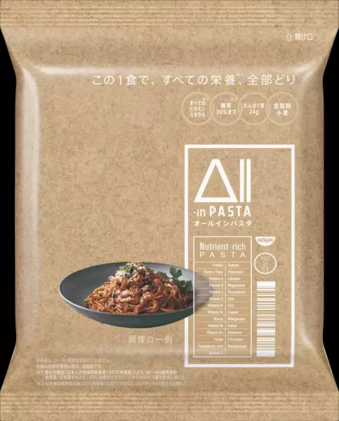 日清食品は、1日に必要なすべての栄養の1/3量を配合した「All-in PASTA」シリーズを、麺とソースがセットになったカップタイプ3品、麺のみの袋タイプ1品の計4品と、別売の専用ソース3品の全7品で発売している。