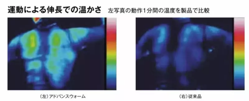 生地が乾いている状態ではもちろん、たとえ濡れても同様の動作をすることで発熱。汗や雨でウエアが濡れても発熱効果が得られ、冬のスポーツ時に重宝する。また、生地の温度が20度を超えると発熱効果が下がっていく設計で開発しているため、衣服内が高温になりすぎることを抑制。吸汗速乾性も備えており、汗冷えを軽減。