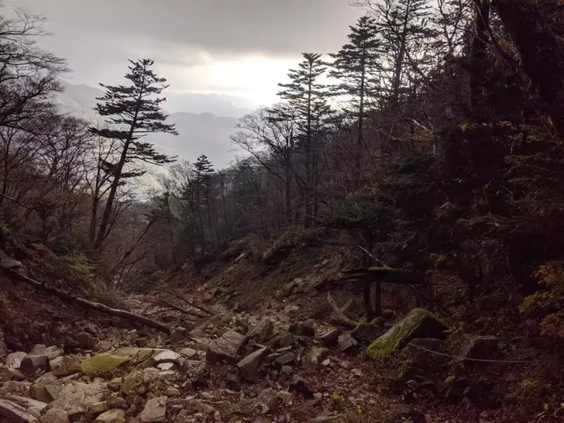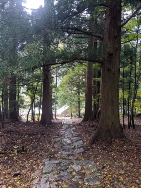 宿坊までの沢地形の中にある登山道は、落ち葉と苔とでわかりにくかった。