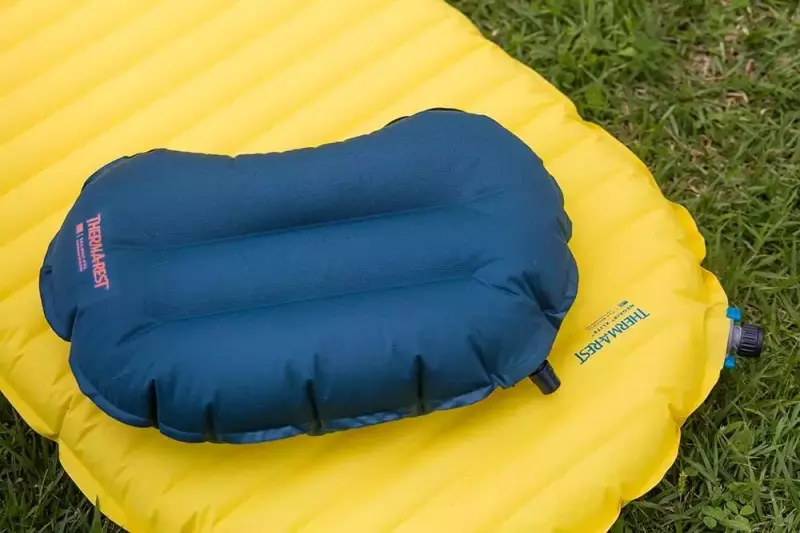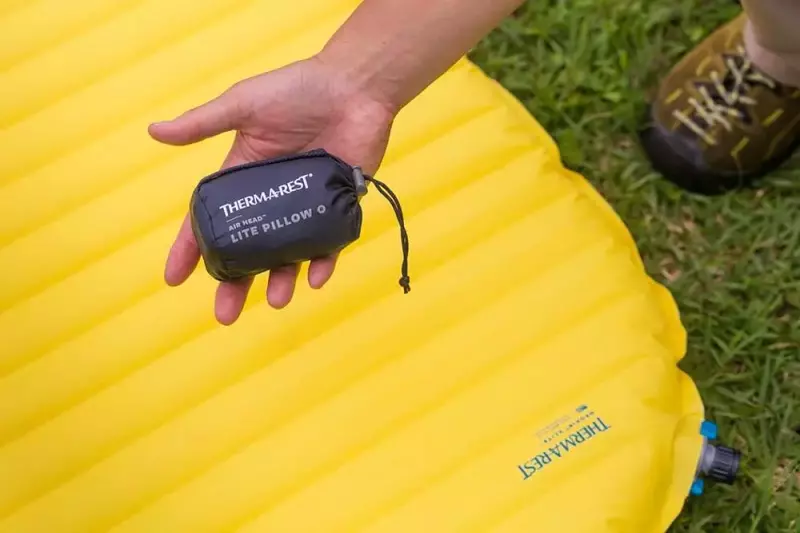 収納時はポケットに入るほど小さく収納できる枕。空気注入式なので、お好みの硬さに調節可能。スリーピングバッグのフードにぴったり収まるデザイン。レギュラーとラージサイズの展開。