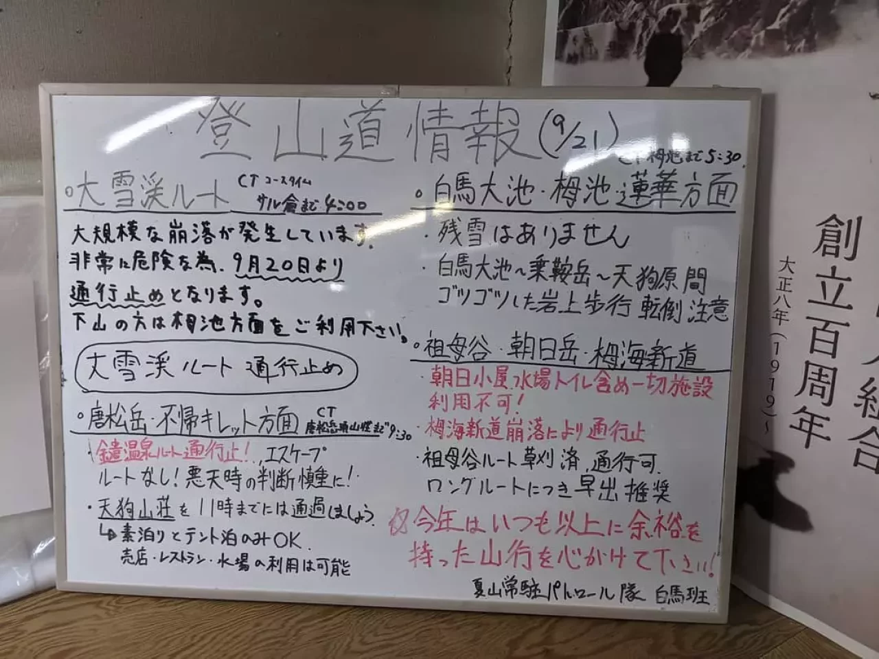 大雪渓は雪がない場合は落石、崩落に気をつける必要があります。以下の写真は2020年9月21日における登山情報だが、大雪渓ルートが通行止めとなっていることがわかります。計画前、出発前と頻繁に登山道情報を山小屋や自治体のウェブサイトで確認をしましょう。