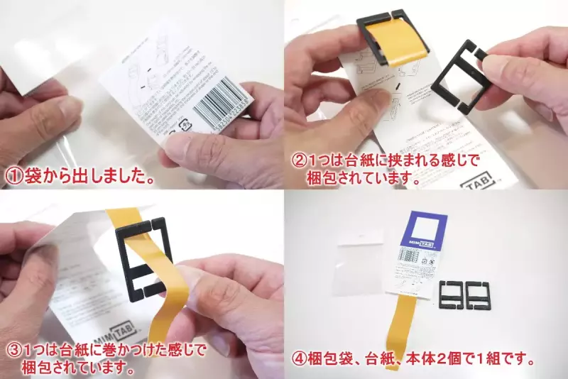 1つは台紙に挟まれる感じで梱包されていて、もう1つは台紙に巻き付けた感じで梱包されています。台紙は単なる梱包材ですが取扱説明書にもなっています。また海外の人向けに英語表記もされています。