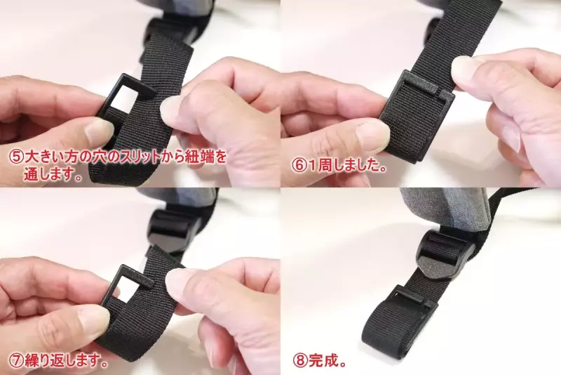 少し丁寧に説明しましたが、簡単に言えば、大きい方の穴、小さい方の穴の順に紐端を通した後、グルグルと紐端を巻き付けていくだけです。