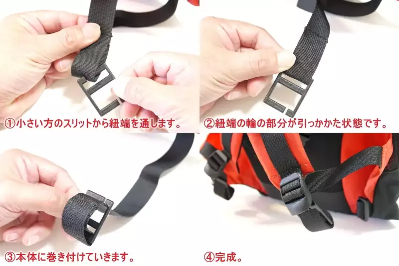 | 商品説明 | だらしなく伸びたリュックの紐端を小さく巻き留めておける紐留具です。 |