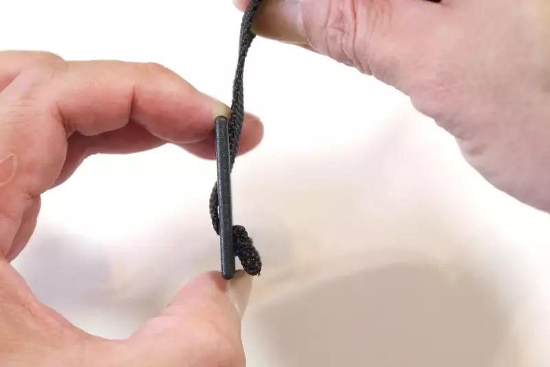 注意点2:紐端が折返し処理されているタイプで使用する場合、小さい方の穴に紐を通した状態で紐端を引っ張ったとき、折返し処理されているところが引っかかることを確認してから使用してください。