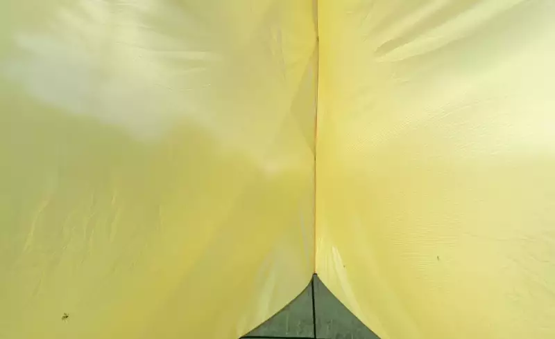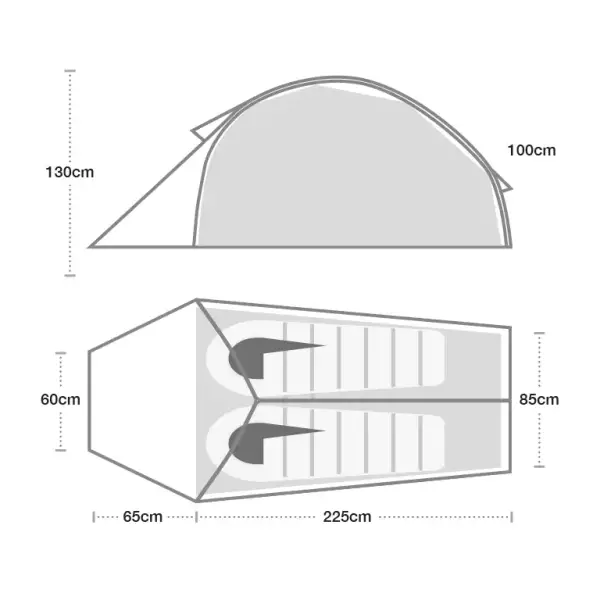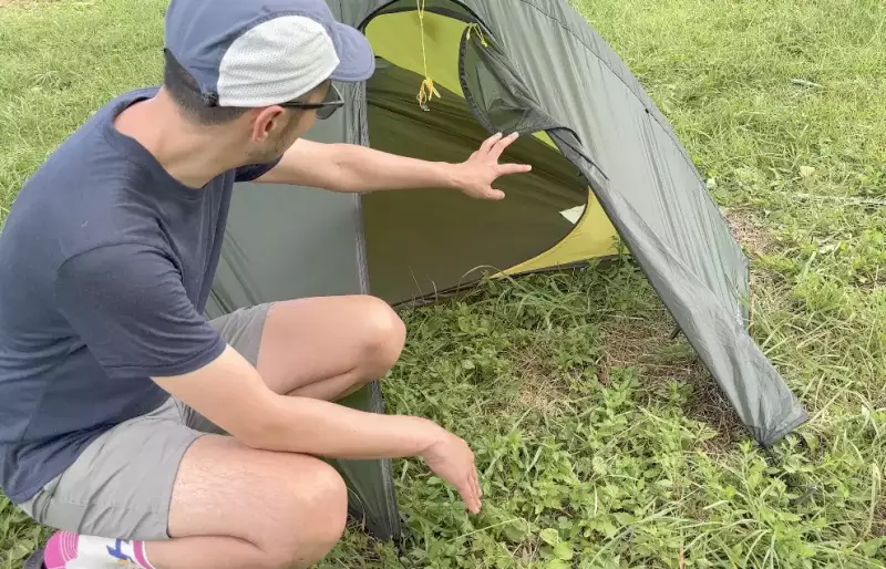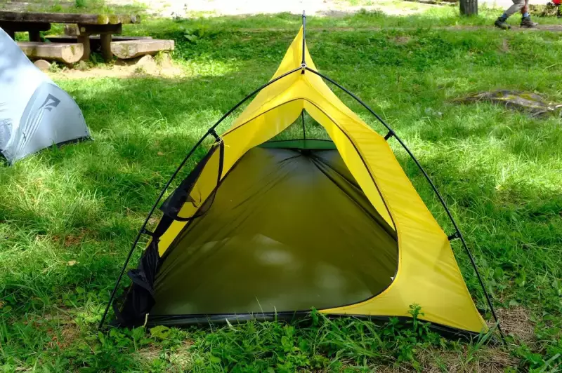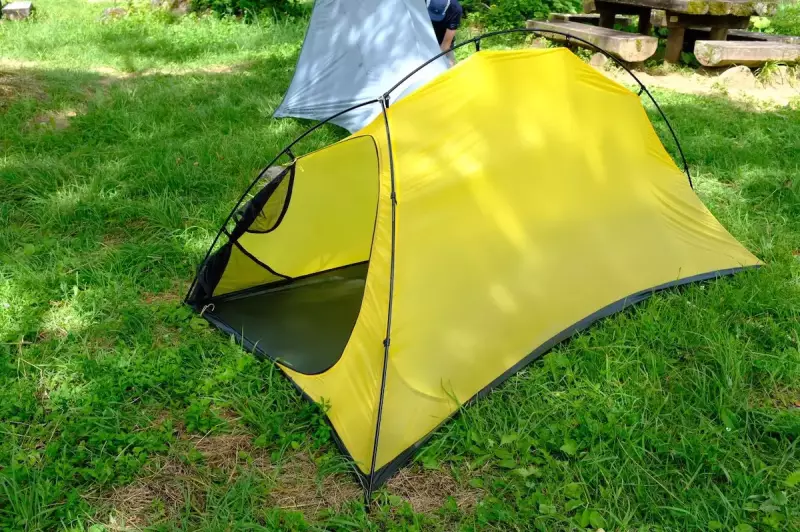 最小重量814gで2人用という驚きの軽さ。入り口は短辺のみで足元にいくに従って低くなっています。