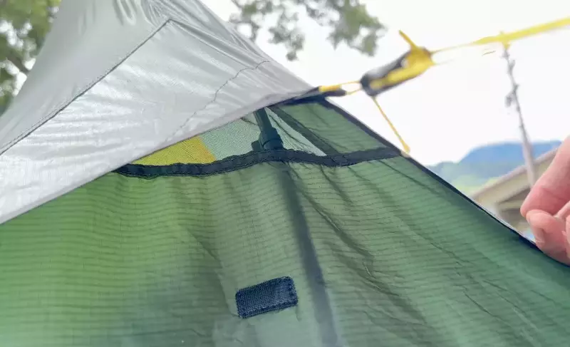 フライシートをかけた時には天井部分にベンチレーションが施され結露を防ぎます。