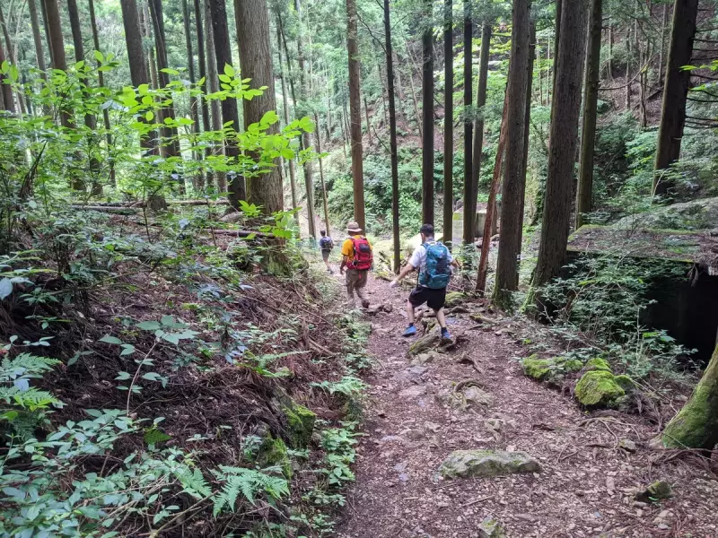 これを見た4人は気が怯むも、YとKは男坂を、DとTは女坂を行く。岩場はなかなかの急登で登り応えがある。YとKは「おお!カッコいいぞ」なんて励まし合いながら岩場を登っていく。中年なんだけど中身は少年のようだ。因みに登りはいいが、下りは危ない。挑戦する際は気をつける必要がありそうだ。