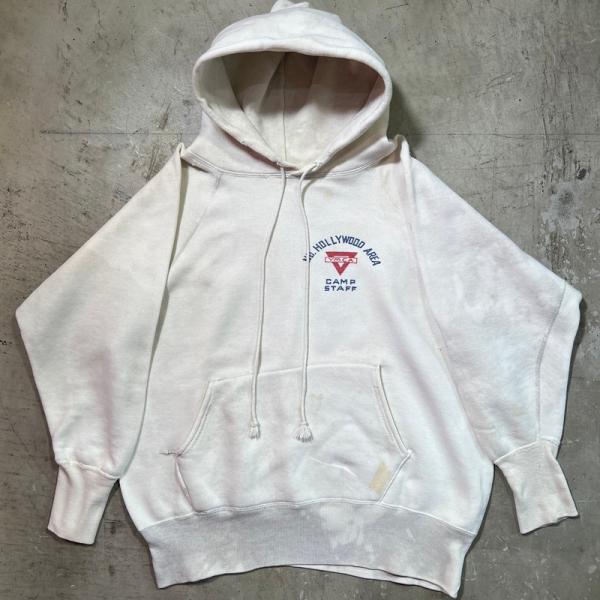 Unknown 【men2573H】 50's YMCA NO.HOLLYWOOD AREA CAMP STAFF スウェットパーカー 染込みプリント ブリーチ リブ長 S~Mサイズ相当 AGYahoo!で見る